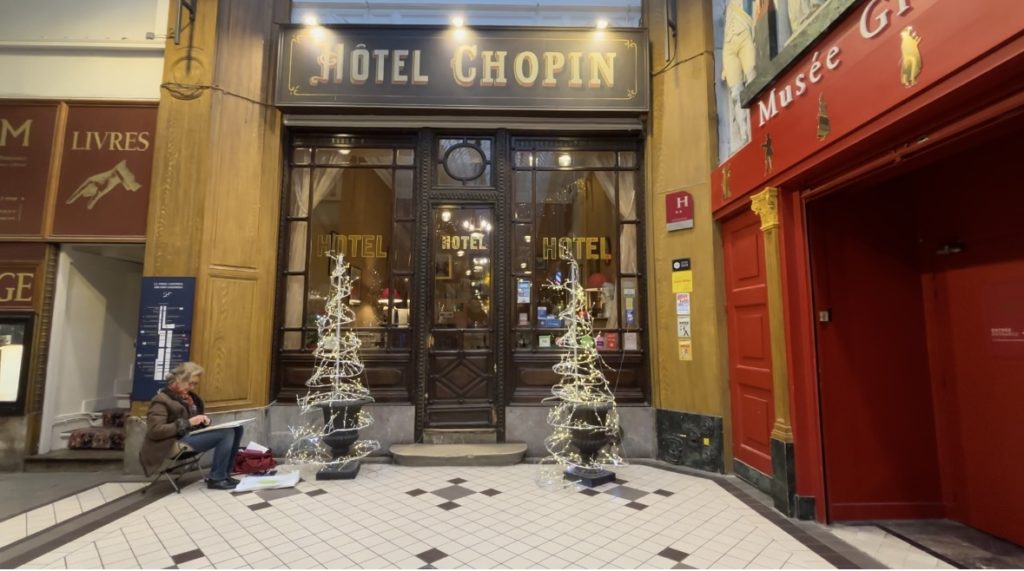 パッサージュの中に「HOTEL CHOPIN」というホテルがあり、とても有名なホテルで写真を撮っている人がたくさんいます。入り口から可愛いです。この日はおしゃれなマダムが絵を描いてました♡
